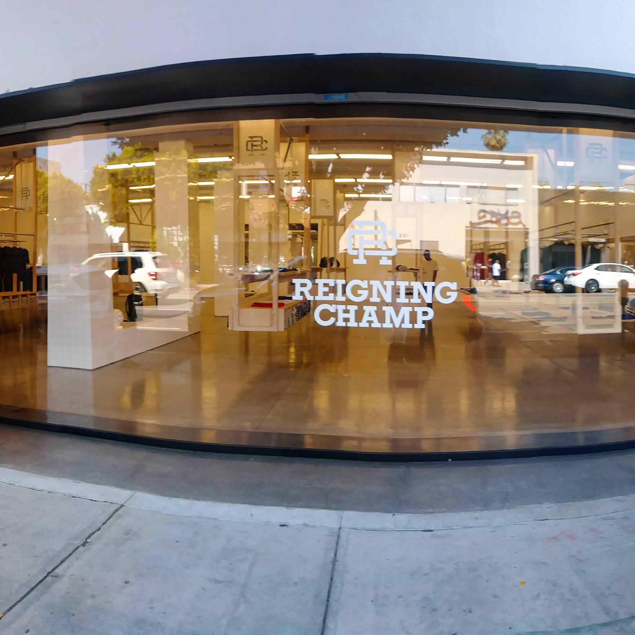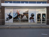 Exterior adhesive window vinyl is stuck to the outside of the window. This application looks best because the material is on top of the glass, meaning you don’t get the reflection from the glass’ surface.